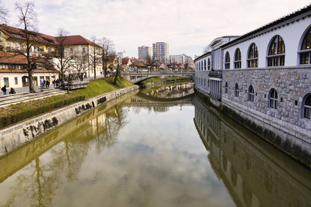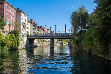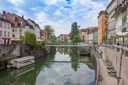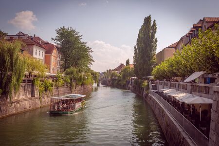 Beautiful landscape of Ljubljanica river flowing in the center of Ljubljana capital city of Slovenia, 2019.07.27