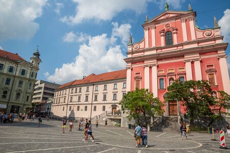 Franciscan Church of the Annunciation on Preseren Square; City center of Ljubljana, the capital of Slovenia 08.2019