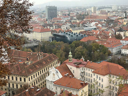 Graz, Austria - November 9, 2018: Architecture and extensive views over the city of Graz that visible from the Schlossberg hilltop in Graz, Austria.