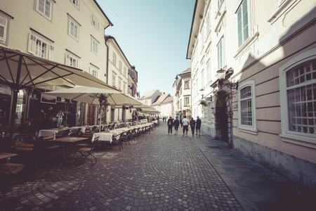 LJUBLJANA, SLOVENIA - SEPTEMBER 24, 2016: Beautiful street in old city centre near the city hall in Ljubljana. Ljubljana is the capital of Slovenia and famous european tourist destination.