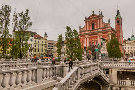 LJUBLJANA, SLOVENIA - MAY 14, 2019: Triple Bridge and Franciscan Church of the Annunciation in Ljubljana, Slovenia