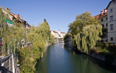 Buildings facing the river in ljubljana with weeping willows on the banks