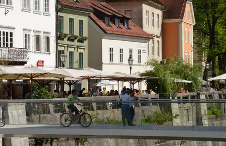 LJUBLJANA, SLOVENIA - APRIL 17, 2014: Hribarjevo embarkment and Triple bridge in Ljubljana, capital city of Slovenia