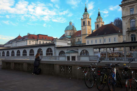Lubiana / Slovenia - December 8, 2017: A girl looks a building in Lubiana, Lubiana, Slovenia