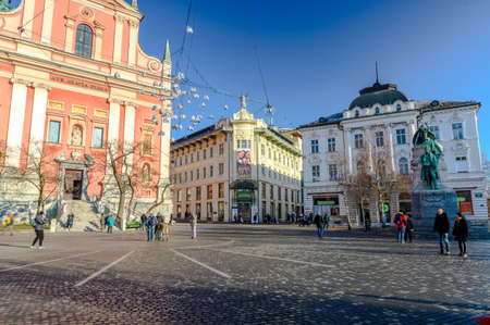 View of the Church of the Annunciation in Ljubljana and Prešeren Square. Center of Ljubljana in Slovenia.