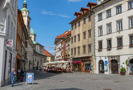 Ljubljana, Slovenia - July 16th 2018: Mestni Trg, Ljubljana City Square beside the town hall, on a summers day, Slovenia