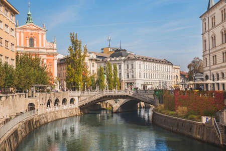 Triple Bridge 3 bridges across Ljubljanica and Franciscan Church in the city center, sunny day