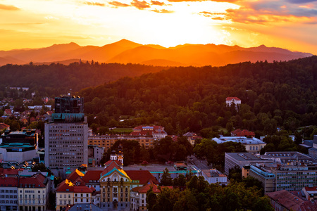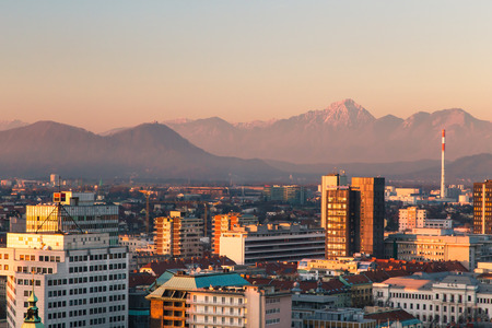 Sunset above Ljubljana with background mountains aerial view, capital of Slovenia