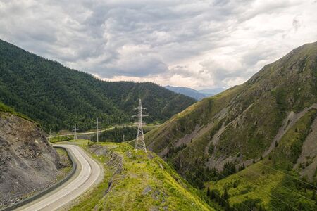Asphalt road  with huge power transmission towers. Landscape with beautiful mountain road with a perfect asphalt. High rocks, amazing sky at sunset in summer. Travel background. Highway at mountains