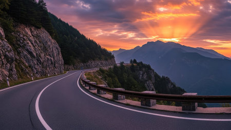Road in the mountains at sunset. Beautiful landscape with asphalt road.
