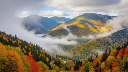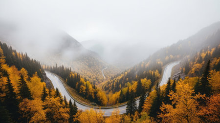Winding road curves through a mountain pass lined with vibrant autumn trees creating a scenic drive Perfect for travel and landscape backgrounds.