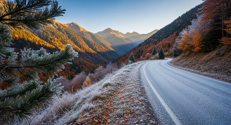 A mountain landscape unfolds as a winding asphalt road carves its way through a valley. The slopes are ablaze with the vibrant colors of autumn foliage, transitioning into frosty, icy edges. Golden sunlight bathes the scene, casting long shadows and highlighting the crisp, cool air. Evergreen pines stand tall against the backdrop of peaks, creating a serene and awe-inspiring vista.
