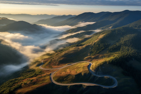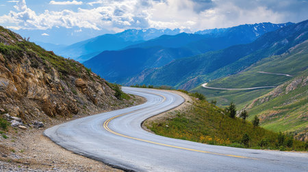 scenic road trip through the mountains, with winding roads and scenic views, created with generative ai