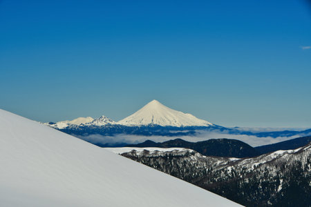 Calbuco volcano Chile winter snow capped panorama mountain blue sky. High quality photo