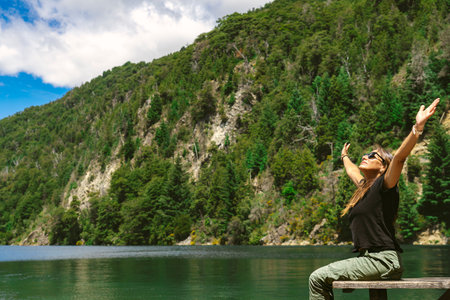 Woman sitting on the dock at the shore of a large lake immersed in oasis of nature.