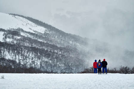NEUQUEN, ARGENTINA - SEPTEMBER 8, 2015: Three people standing on the snow in front of majestic landscape of snowy mountain with forest of dry trees seen from Cerro Bayo (Bayo Hill).