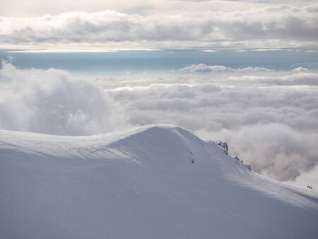 Mount Elbrus in sunlight above clouds. Caucasus mountains winter view