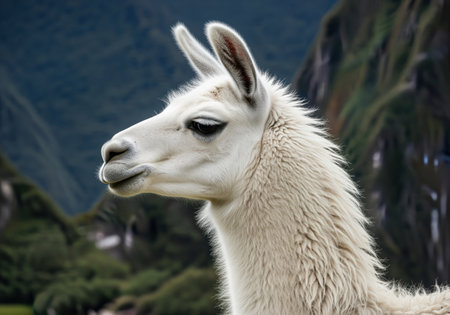 White llama in profile, captured in a close up shot showcasing its thick woolly coat. rugged green and blue mountains form the natural background, symbolizing travel and wildlife in the andes region.