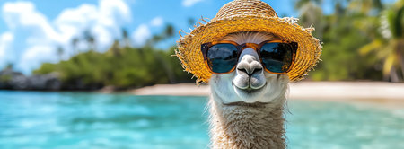 Llama in sunglasses and straw hat by a tropical beach, clear blue water, relaxed and sunny vibe