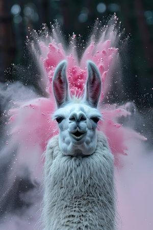 Whimsical Llama with Magical Pink Splash on Ethereal Background for Creative Design Uses AI Generative