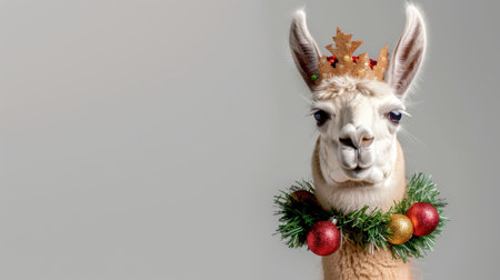 This charming image features a cute llama adorned with a festive crown and a colorful garland, perfect for holiday-themed projects and cheerful seasonal d