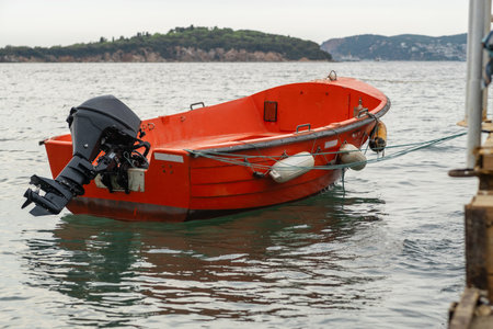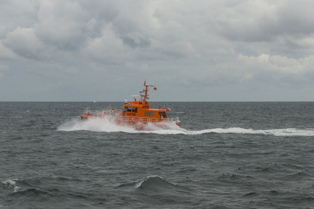 Orange-and-white life boat moving fast in the water. Life saving equipment concept.