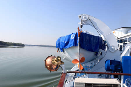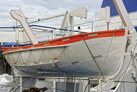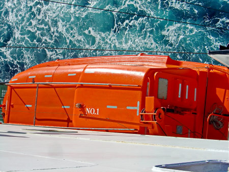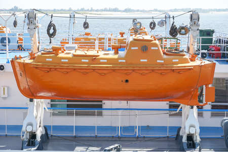 A lifeboat with an engine and steering mechanism on the upper deck of the ship. A ship's lifeboat is a collective rescue vehicle used to evacuate a ship.