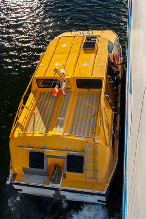 A lifeboat in case of an accident in the port or on a ship. The orange boat.