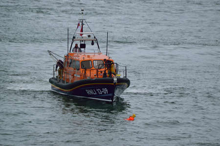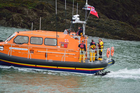 TENBY, WALES - JUNE 15 2021: The RNLI Tamar class offshore lifeboat Haydn Miller launches from the slipway at the lifeboat station in the resort town of Tenby, Pembrokeshire, Wales