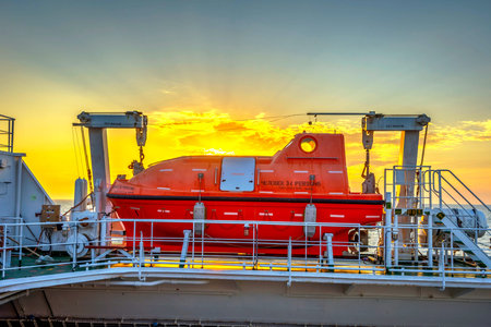 Detail of a lifeboat on a cruise ship or ferry at a romantic evening sunset setting. Rescue lifeboats high up on a crane, ready to be deployed.