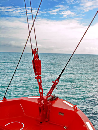 View from top on the orange colour life boat with reflective tape stickers secured with davits and safety hooks on the merchant cargo container vessel sailing through Atlantic Ocean during sunny day.