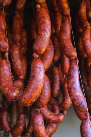 Traditionally ready homemade sausages exposed for sale.
