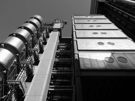 LONDON, UK - CIRCA SEPTEMBER 2019: Lloyd of London high tech skyscraper designed by architect Richard Rogers in black and white