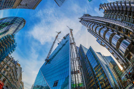 LONDON, ENGLAND - NOVEMBER 27, 2017: Wide angle shot of skyscrapers in Central London, including the Lloyd's Building (also known as The Inside-Out Building),Gherkin tower and building in construction