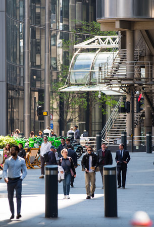 London, UK - 7 May, 2024: Business people walking next to Lloyd's building entrance at Lime Street in the City of London