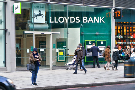 London, United Kingdom - February 02, 2019: People walk in front of Lloyds Bank branch at Victoria. It is British retail and commercial bank founded 1765 with more than 1300 sites (as of 2019) in UK