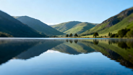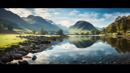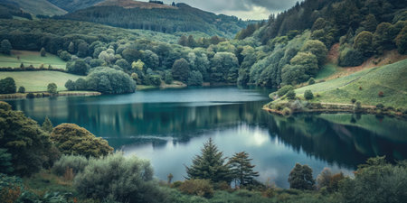 An AI generated illustration of a tranquil lake surrounded by lush green hills