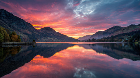 Vibrant sunset colors paint the sky above a serene lake surrounded by mountains. The still water reflects the brilliant hues, creating a picturesque autumn landscape.