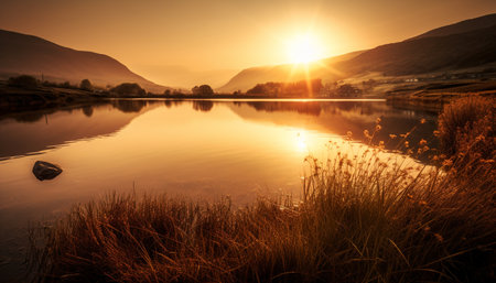 Sunrise over tranquil mountain range, reflecting beauty generated by artificial intelligence