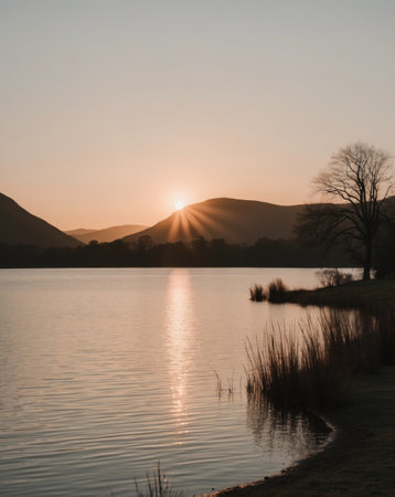 Peaceful sunrise over calm lake with mirrored reflections of trees and hills in soft light