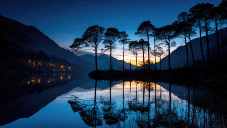 Reflection of pine trees on the lake at Dusk, New Zealand