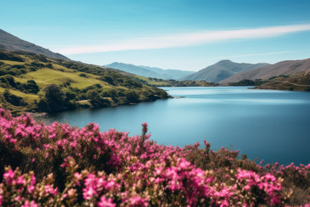 Picturesque Harmony: Captivating Pink Flowers Amidst a Serene Blue Lake and Rolling Hills