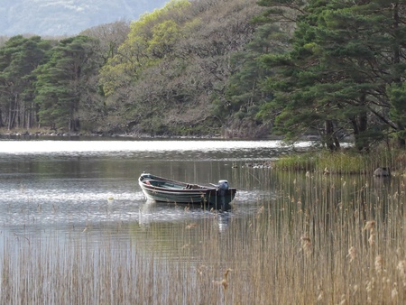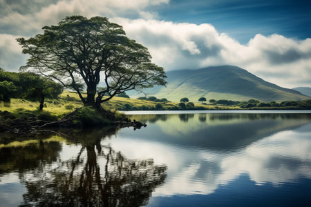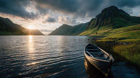 Peaceful lake with boat. Verdant mountains reflect in calm water. Golden hour illuminates scenic landscape. Natural beauty of ireland.