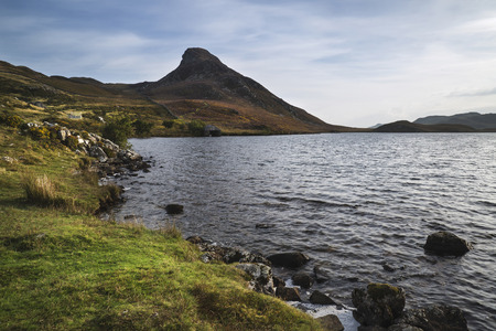 Scenic view of the Loch Glascarnoch and the surrounding hills on a spring sunny day as viewed from the Glascarnoch Dam in Scotland, UK