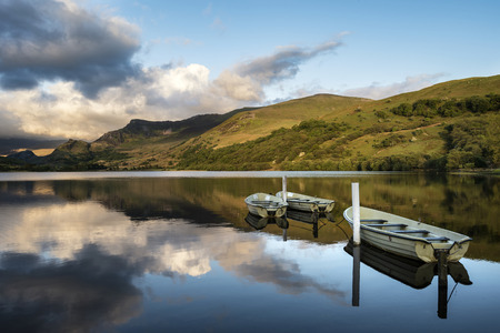 Countryside landscape and mountains in beautiful morning light reflected in calm Cregennen Lakes in Snwodonia National Park
