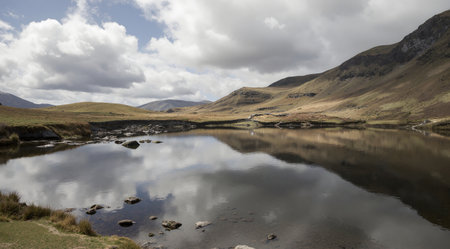 a river flows through the picturesque scottish landscape captured in this photo. with an 8k resolution, the image showcases a serene atmosphere with pastoral settings. the color palette features a combination of dark cyan and light amber, complemented by hints of light pink and amber. this photo is available under the creative commons attribution license. ai generated