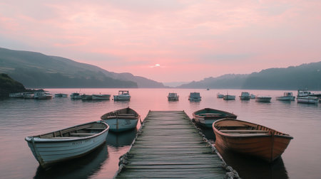 Sunrise on the lake with boats in the foreground, Lake District, England