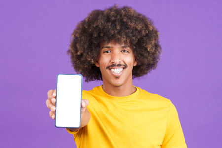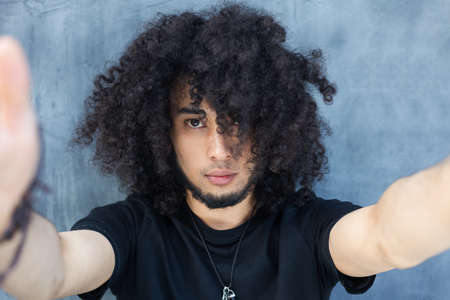 Handsome young African man making selfie while standing against grey background. Afro hair. I love selfie.