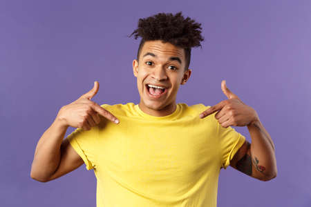 I am what you need. Close-up portrait of charismatic, cute smiling man boastful, proudly pointing at himself and talking won accomplishment, want to be candidate, participant, purple background