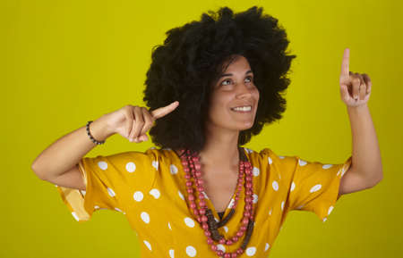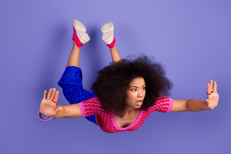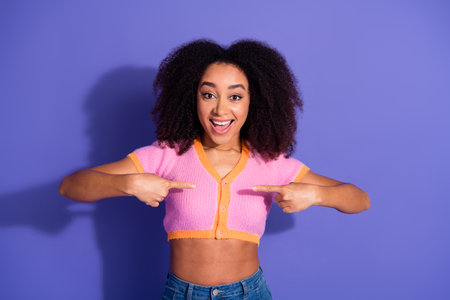Cheerful young woman with afro hairstyle making playful gestures posing on a purple background in vibrant and stylish outfit